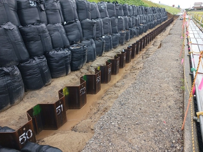 当工事は出雲市神門沖町地先、神戸川左岸堤防(5K450~5K539)の地盤対策工として25H型広幅鋼矢板(L=23.5m~24.5m)を圧入し、周辺への地盤沈下の影響を断つことを目的とする工事でした。工事に際しましては、地元の皆様のご理解・ご協力により無事に完成することができました。