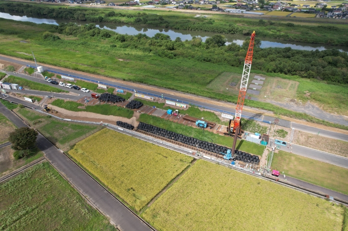当工事は出雲市神門沖町地先、神戸川左岸堤防(5K450~5K539)の地盤対策工として25H型広幅鋼矢板(L=23.5m~24.5m)を圧入し、周辺への地盤沈下の影響を断つことを目的とする工事でした。工事に際しましては、地元の皆様のご理解・ご協力により無事に完成することができました。