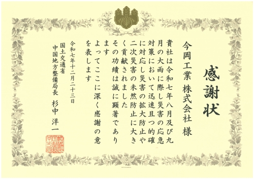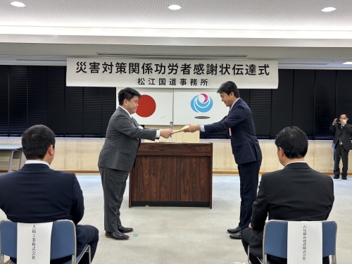 これらの取り組みが評価され、このたび国土交通省中国地方整備局松江国道事務所長 三浦様より感謝状を拝受いたしました。